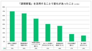 A:ネット上の口コミでは、調理家電を使って便利だったという声が多数寄せられています。例えば、アイランド株式会社が行った調査では、「調理家電」の活用で変化があったことに対して、「効率がよく調理ができた(70%)」、「調理時間が短縮できた(65%)」、「料理に品数やレパートリーが増えた(53%)」が上位となっています。記事を作成する際に参考にしたサイトは、https://prtimes.jp/です。注1